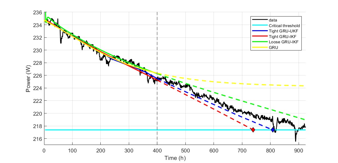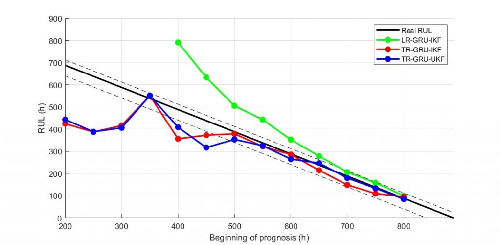 This thesis addresses the estimation of the Remaining Useful Life (RUL) of a proton exchange membrane fuel cell by combining physical modeling with artificial intelligence. The objective is to develop reliable and robust predictive maintenance methods. A nonlinear degradation model has been developed to represent the evolution of the fuel cell’s performance over time. The proposed approach is hybrid: it integrates a robust Kalman filter with recurrent neural networks to estimate states whose dynamics are not explicitly known. This combination leverages both physical knowledge and the iterative structure of the model, while exploiting the predictive power of sequential learning methods. Particular attention is given to numerical stability issues and computational costs typically associated with classical methods. Different hybridization strategies, loose and tight, have been investigated in order to balance accuracy, robustness, and efficiency. The use of robust functions and semi-supervised learning compensates for the lack of direct access to internal states. Experimental results are obtained from a dataset generated through accelerated aging tests. The contribution offers a trade-off between RUL prediction accuracy and computational cost. Comparisons with alternative approaches, purely model-based, purely data-driven, or loosely coupled, confirm the superiority of the proposed method. In particular, it improves prediction accuracy while mitigating training instabilities.